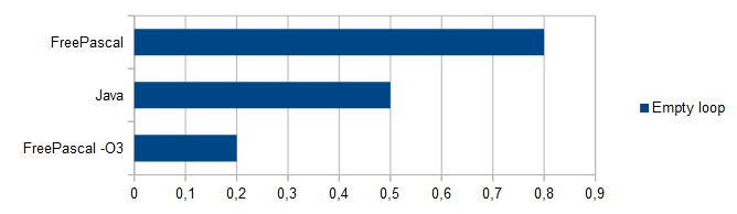 Не знаю почему, но выполнение пустого цикла - единственная задача, с которой код на Java справился быстрее, чем код на FPC (среди рассмотренных мною тестовых задач). Однако FPC с включённой оптимизацией третьего уровня всё-таки выполняет и эту задачу быстрее.