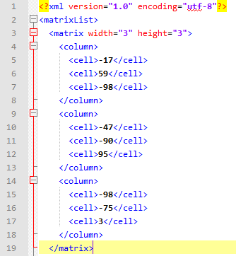 XML-файл с произведениями матриц сохранялся на SD-карту телефона в '/mnt/sdcard'. Я создаю на карте памяти два отдельных файла: с результатами работы кода на Java и с результатами работы кода на FreePascal. Вот начало содержимого результирующего файла от кода на FreePascal:
