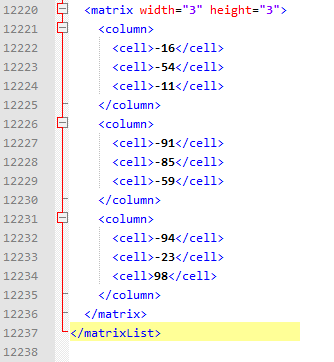 Корневой элемент 'matrixList' (список матриц), в нём элементы 'matrix' (матрица), в них в свою очередь элементы 'column' (колонка) и 'cell' (ячейка). В финальном варианте теста было 100 матриц размером 10x10. Каждая ячейка матрицы содержит целое число от -100000 до +100000. Этот файл я назвал data.xml. После того как файл сгенерирован с помощью программы PJMatrixGenPro, его нужно положить в подпапку assets папки с Android-проектом Eclipse ADT.