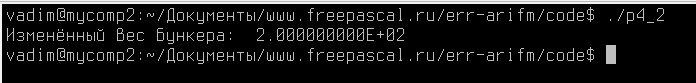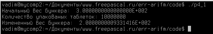В данном случае нас интересует именно мантисса. А у мантиссы для типа "Single" предусмотрено всего лишь 7 разрядов числа. Хотя в спецификации FreePascal написано 7-8, но надо ориентироваться именно на 7, которые определены в IEEE 754. А теперь давайте вернёмся к исходному коду и посчитаем, сколько у нас разрядов в исходных данных, ведь никакой экспоненты там нет и в помине, следовательно всё число у нас одна сплошная мантисса. Вот тут то и становится видна самая главная ошибочка, которая привела к тому, что после присваивания исходных данных переменной, в них оказались совсем не те числа, которые мы задавали - компилятор их просто урезал, чтобы втиснуть в 7-ми разрядную мантиссу. Мало то, даже и по тем исходным данным, что получились после обрезания и то результат неверный. Как говориться - приходи кума любоваться: