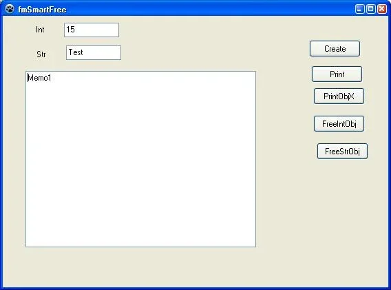 При тестировании надо сначала создать кнопкой Create объекты, потом проверить их содержимое кнопкой Print. Потом освободить FreeIntObj и/или FreeStrObj. Теперь при нажатии на PrintObjX вы получите ошибку, хотя его поля это дублированные ссылки, которые никто явно не освобождал.