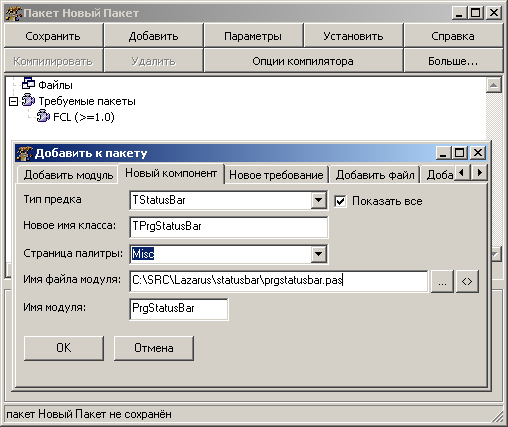 На экране возникнет окно управления пакетом. Сохраним наш новый и пока пустой пакет в отдельном каталоге под именем, например, prgstatusbarlaz.lpk. Теперь добавим новый компонент. Вообще говоря, один пакет может содержать сколько угодно компонентов, но нам пока достаточно одного. Нажмите кнопку "Добавить" и в появившейся форме перейдите на вкладку "Новый компонент". Заполните все поля примерно так, как показано на рисунке: