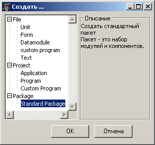 Так как для добавления компонентов в палитру компонент Lazarus используются пакеты, сначала создадим новый пакет. Для этого в меню "Файл" выберем пункт "Создать". В левой части появившегося окна выберем "Standard Package" и нажмём кнопку "OK", как показано на рисунке:
