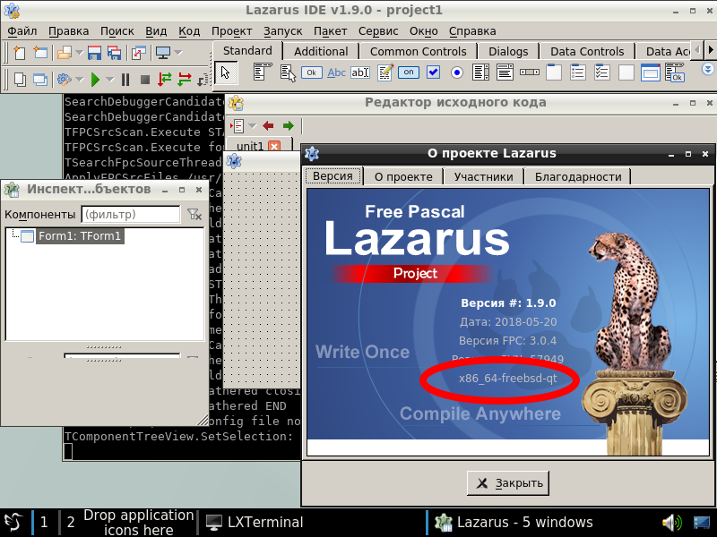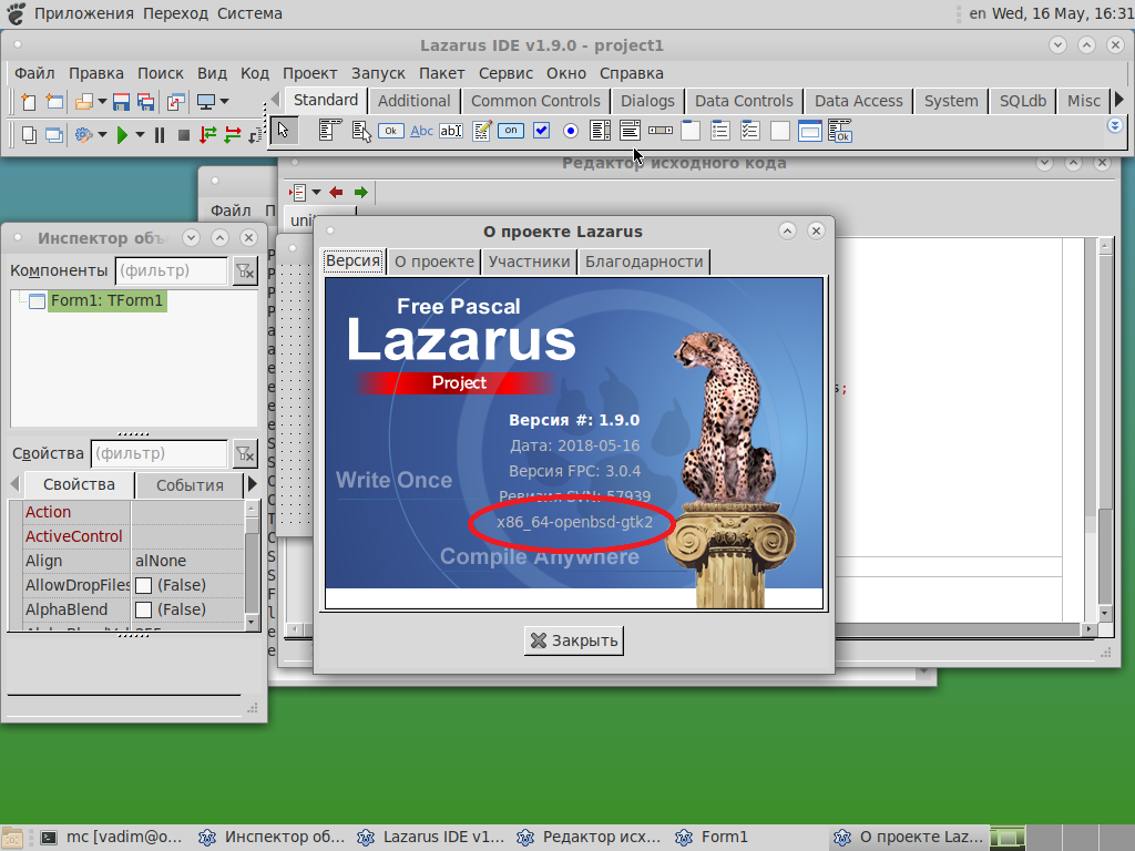 и толко наблюдая процесс сборки вспомнил, что не обрубил хвосты у билбиотек путём создания симлинков, что сам же и рекомендовал в пункте 4 про Linix. Однако, к моему большому удивлению, никаких жалоб на отсутствие библиотек не поступило. Держась левой рукой за сердце, дрожащей правой запускаю Lazarus. И Lazarus без вопросов запустился. Судя по рисунку он у меня собран именно в OpenBSD и никак иначе: