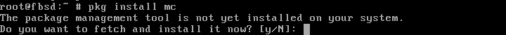 В отличие от OpenBSD, в FreeBSD путь к интернет-репозиторию текущей версии ситемы уже находится в файле конфигурации, поэтому сразу же после установки ОС можно приступать к установке пакетов. Опять же, в отличие от OpenBSD, все необходимые манипуляции (поиск, установка, удаление и т.п.) делаются единым пакетным менеджером "pkg". Однако при первом его запуске будет выдано сообщение о том, что система управления пакетами не установлена. И вопрос − нужно ли её устанавливать: