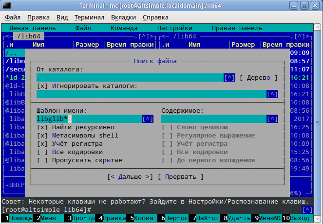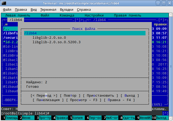 Давайте зайдём в каталог "/lib64" (у меня система 64-ёхразрядна) и поищем "libglib-2.0.so", но не по полному названию, а по шаблону, как на рис. 3.