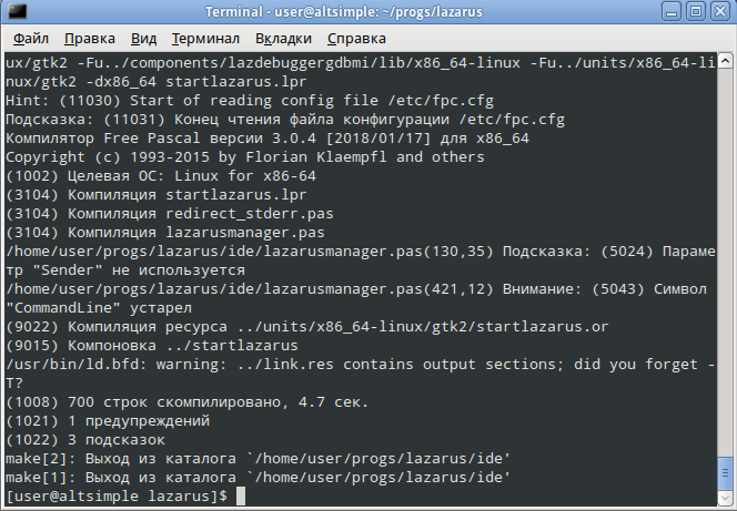 И я искренне надеюсь, что исходный код lazaus [1] вы тоже скачали и распаковали куда-нибудь в свой домашний каталог. Пускай это будет "~/progs/lazarus". В домашнем каталогк вам для компиляции права root не понадобятся, что очень удобно − невозможно будет случайно повредить что-нибудь системное...