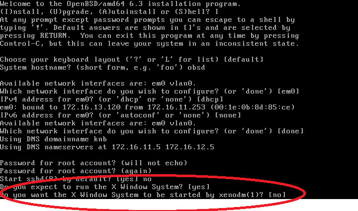 Несмотря на то, что интерфейс установщика OpenBSD не графический, как в Linux'ах, и даже не псевдографический, как во FreeBSD, вопросы, которые он задаёт просты и понятны. В 99,99% случаев можно в качестве ответа просто жать клавишу "ENTER". Однако есть там один момент, на котором хочется остановится особо. Перед распаковкой архивов с системой, установщик задаёт вопрос, нужно ли запускать графическую систему при старте ОС (см. рис. 11, последние два вопроса).