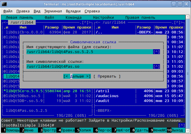 Это значит, что компилятор такие "хвосты" не любит. Обычно по этому поводу советуют ставить еще и "devel" версии библиотек. Если вы собираетесь писать GUI-программы на Си\Си++, то это в высшей степени полезный и единственно правильный совет. Однако я, к примеру, этого никогда не делал и добровольно делать не собираюсь. Как решить эту проблему, если не хочу ставить "devel"-пакеты? "Хвосты" библиотекам мы конечно же подрезать не будем (на всякий случай). Мне удалось узнать страшную тайну этих самых "devel"-пакетов − при своей установки, кроме добавления всяких нужных для сборки Си-программ файлов (типа "*.h", "*.a", "*.o" и т.п.), они ещё и делают безхвостый симлинк (символическую ссылку) рабочих библиотек. Так что мы тоже просто сделаем символическую ссылку с правильным названием (см. рис. 5) без всяких установок "devel"-пакетов: