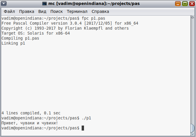 Увы нам всем, результаты поиска нулевые. Однако расстраиваться не стоит, FreePascal (а заодно и Lazarus) можно скачать с сайта разработчиков в подразделе "solaris". При установке с помощью скрипта "install.sh", который идёт в архиве, посыпались предупреждения, что метки времени файлов неправильные, однако на работоспособность "fpc" это не повлияло. Правда при попытке откомпилировать тестовую программу на FreePascal выяснилось, что в системе отсутствует компоновщик "gld". Это заставило подозревать, что в системе отсутствуют вообще какие-либо компиляторы, в частности "gcc". Так оно и оказалось. Устанавливаем: