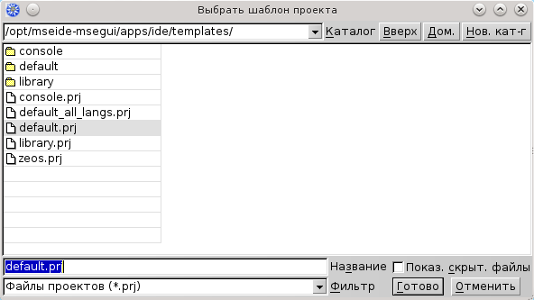 В этом месте MSEide предлагает вам выбрать файл-шаблон для нового проекта. Нас интересует шаблон default.prj или default_all_langs.prj. Шаблон default.prj лучше, чем default_all_langs.prj, так как размер исполняемого файла меньше, но шаблон default_all_langs.prj позволит подключить языковые константы автоматически, и диалоги (например, диалог открытия файла), служебные окна (например, обработка некорректного ввода) станут в вашей программе на языке системы. В данном случае у нас нет никаких диалогов и служебных окон, поэтому, нам достаточно шаблона default.prj. Выберите и жмите кнопку Ok.