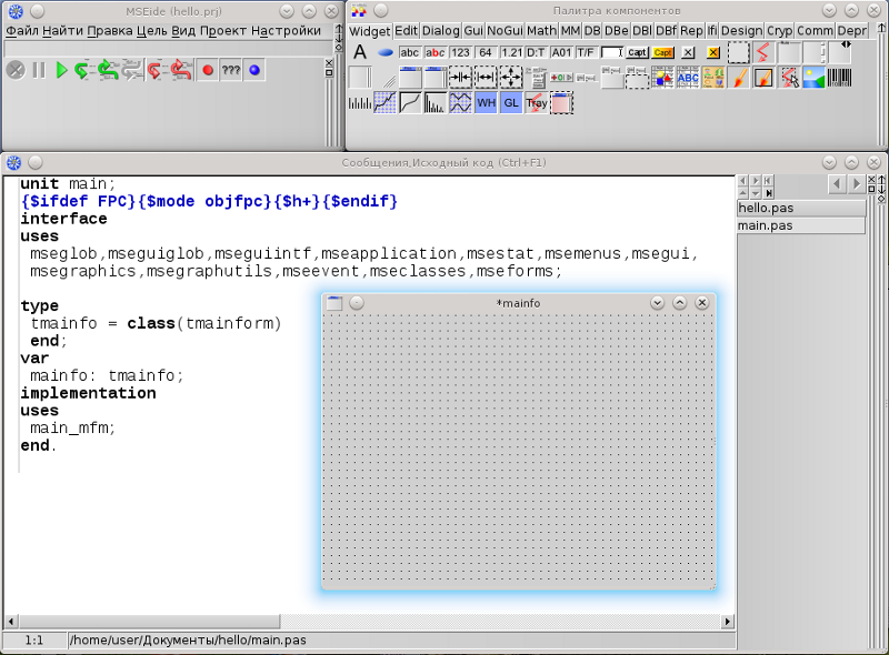 Вот вы и создали свой первый проект. Выглядит это приблизительно так как на картинке. Хотя точного визуального соответствия мы скорее всего не получим, но у вас должно получиться как минимум четыре окна - 'MSEide (hello.prj)', 'Палитра компонентов(Component palette)', 'Сообщения,Исходный код(Source,Messages) (Ctrl+F1)' и '*mainfo'. Это, как вы уже догадались, я заголовки перечислил. Кликните мышкой на окно '*mainfo' (самое маленькое). Теперь вы получили еще одно очень важное окно - 'Инспектор объектов mainfo(Object inspector mainfo)'. Более подробно обо всех этих окнах я расскажу в следующих разделах.