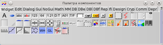 Компонеты расположены на нескольких страницах. Для переключения между страницами кликайте на закладки в верхней части окна. Если вы подержите какое-то время курсор мыши над компонентом, то появится подсказка с классом (типом) этого компонента.