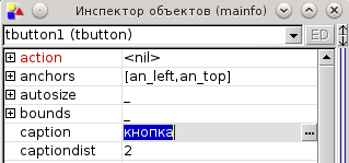 Перейдите в окно ('Инспектора объектовов mainfo(Object inspector mainfo)'). В выпадающем списке выберите (если там еще не выбрано) tbutton1 (tbutton). Ниже в поле, расположенном справа от поля caption, наберите - кнопка. Сейчас вы установили значение свойства caption в 'кнопка'. Запомните это:
