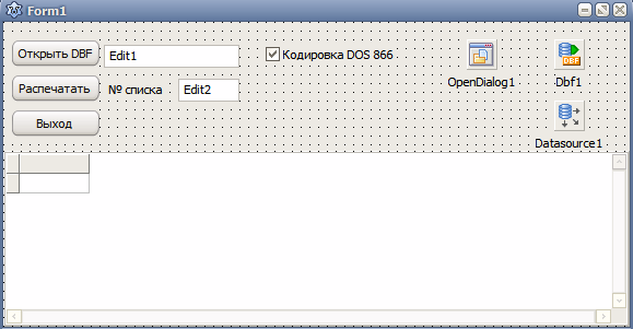 Запускаем среду Lazarus, создаем новый проект (меню Проект>Создать проект), на форме с палитры компонентов "Standard" размещаем три кнопки TButton, одну метку TLabel, два поля ввода TEdit, один чекбок TCheckBox и панель TPanel, переходим на вкладку "Dialogs" и размещаем диалог открытия файла TOpenDialog, затем на вкладке "Data Access" выбираем компоненты TDataSource и TDbf, и напоследок из вкладки "Data Controls" размещаем на компоненте Panel1 компонент TDbGrid.