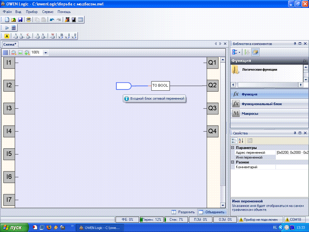 В программе использованы блок входной сетевой переменной с адресом $200 и преобразователь в булевское значение. В сетевых настройках реле выставлена скорость 115200, адрес прибора 1, без бита паритета. На этом настройка реле закончена.