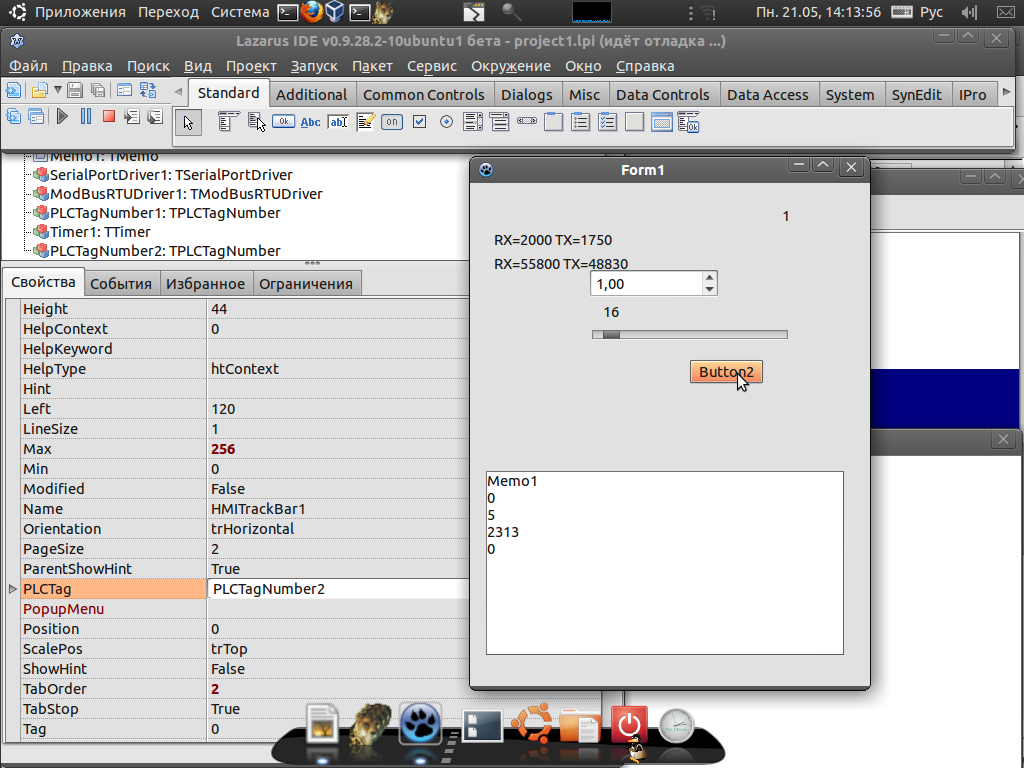 Я добавил еще кнопку на форму для управления выходным каналом реле и компонент THMITrackBar, для отображения состояния входов реле. В THMITrackBar нужно выставить свойство PLCTag = PLCTagNumber2.