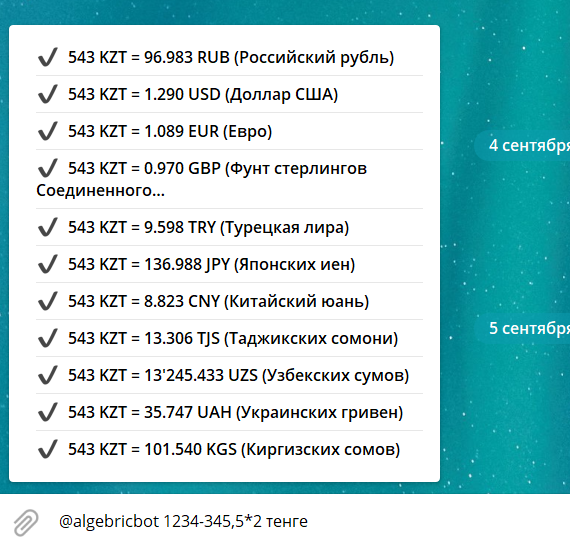 Телеграм бот, считающий алгебраические выражения (+ тригонометрические). Если в конце поставить валюту, то посчитает еще по курсу ЦБ РФ.