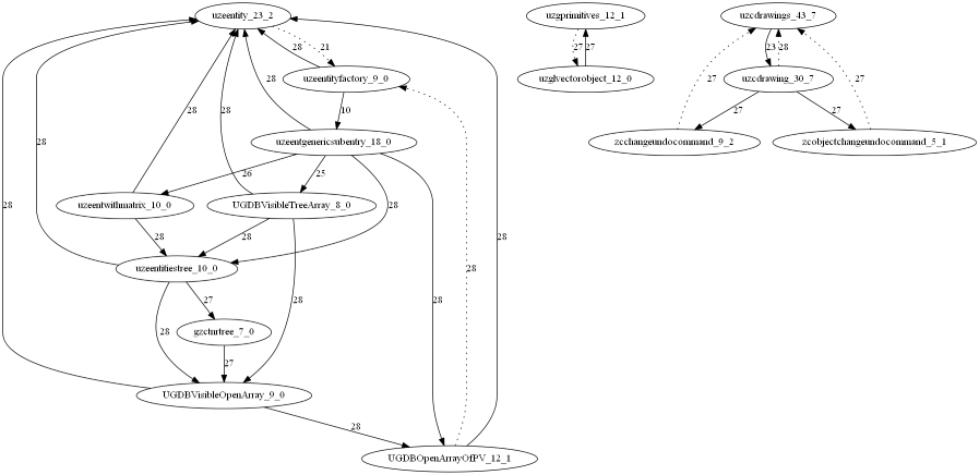 Пунктирные связи из implementation uses, сплошные связи из interface uses