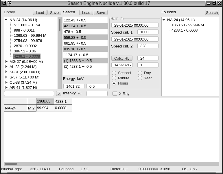 Задуман как инструмент для облегчения поиска нужных линий, расчет периода полураспада в качестве бонуса. Большинство программ позволяют найти энергию, иногда по заданному диапазону. Но это всего лишь функция тупой библиотеки. Т.е., вся рутина по идентификации (поиск совпадающих линий и сравнение интенсивностей) ложится на спектрометриста. Любому нормальному инженеру поперек яиц по десять раз пересматривать обрыдлевшие таблицы, сопоставляя в уме энергии, квантовые выходы и реальные площади зарегестрированных пиков, помня при этом еще и об эффективности регистрации. В общем, всем, кого это задолбало, посвящается эта программа. Никаких революций, работать все же придется. Другое дело, что примитивное сопоставление и поиск может сделать и компьютер. Остается скорректировать диапазоны поиска/сопоставления и оценить результат по матрице совпадений.